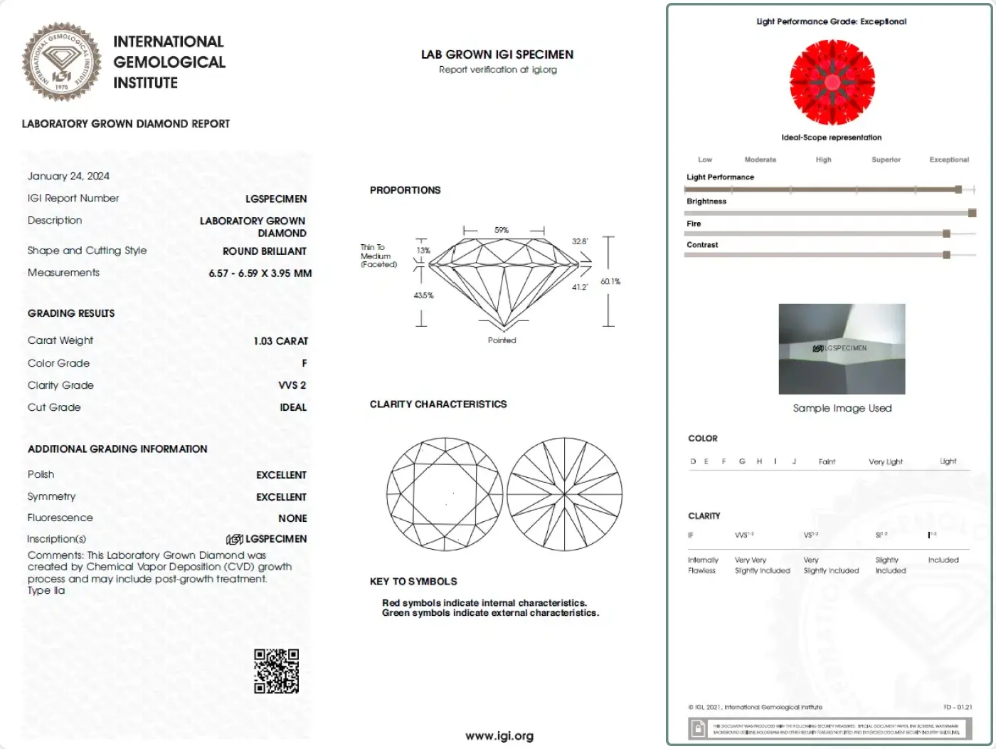 The Light Performance Report by the International Gemological Institute (IGI) is an essential tool when it comes to round diamonds - offering a comprehensive evaluation of how a diamond interacts with light. While most standard diamond reports focus primarily on the 4 C’s - cut, color, clarity, and carat, the Light Performance Report focuses on properties such as a diamond’s brilliance, fire, and contrast. These three characteristics define a diamond’s scintillation, a quality that many consumers consider to be the most appealing in a diamond.